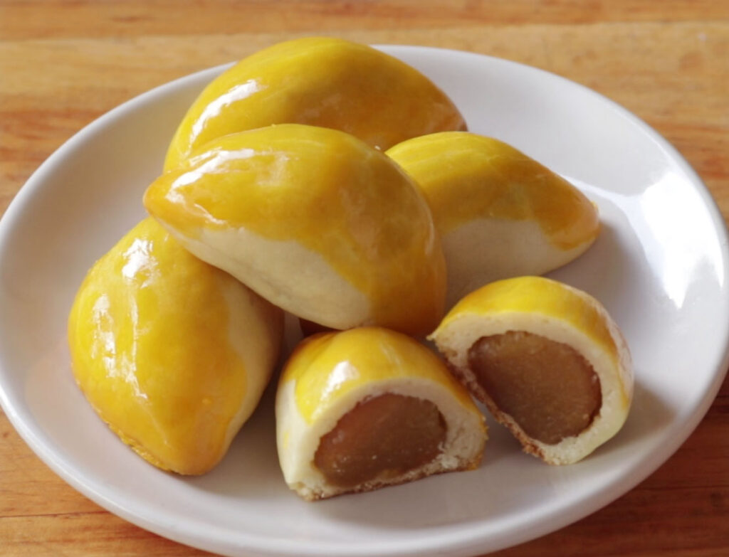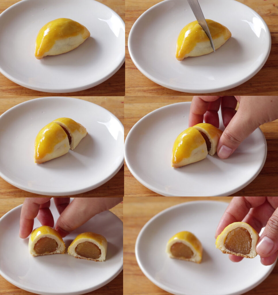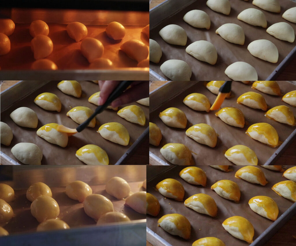 4.นำไปอบไ ฟ 170-180ํ ํ C ไ ฟบน-ล่าง เป็นเวลา 13-15 นาที พออบเสร็จพักไว้สักครู่จากนั้นทาไข่แดง(ไข่แดง+นม+สีเหลือง)