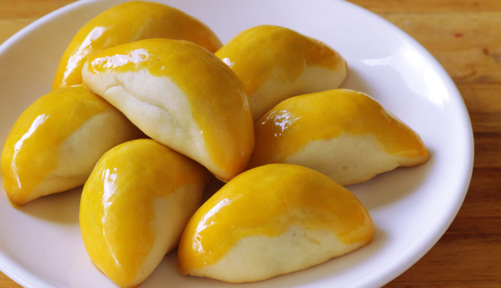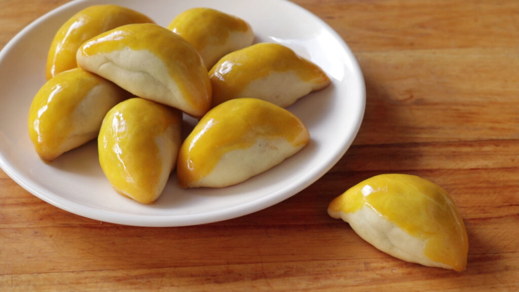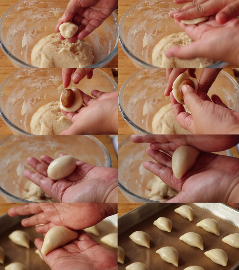 นำไ ส้ทุเรียนกวนชั่ งลูกละ 15 กรัม คลึงเป็นวงรี ห่อไปกับแป้งโมจิ จากนั้นคลึงด้านข้าง ให้เป็นปลายแ ห ลม ออกทั้ง 2 ข้าง