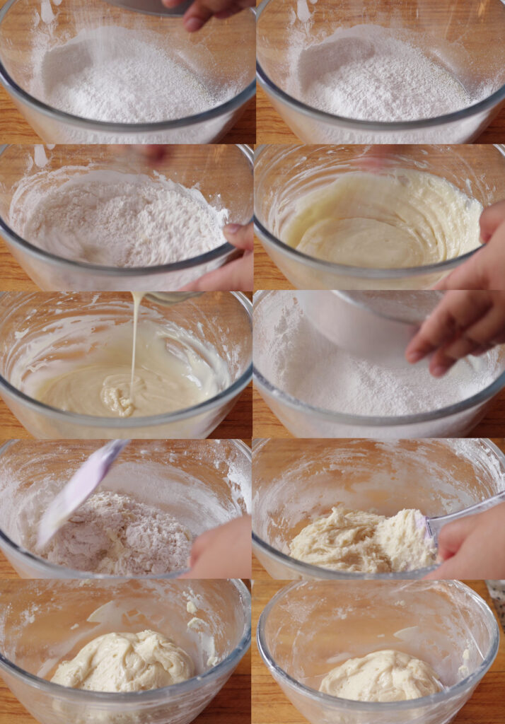 ใช้ไม้พายคนจนเข้ากัน จากนั้นพักแป้งไว้ 1-2 ชั่วโมง