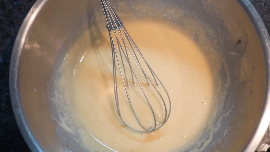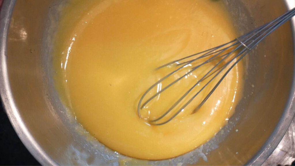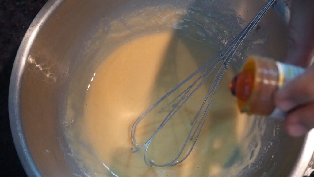 6. นำน้ำส้มสายชูและน้ำมันพืชค่อยๆทยอยใส่แล้วคนให้เข้ากันจนกว่าจะหมด หรือแบ่งใส่3 รอบ เช่น รอบที่1น้ำส้มสายชู – น้ำมันพืช