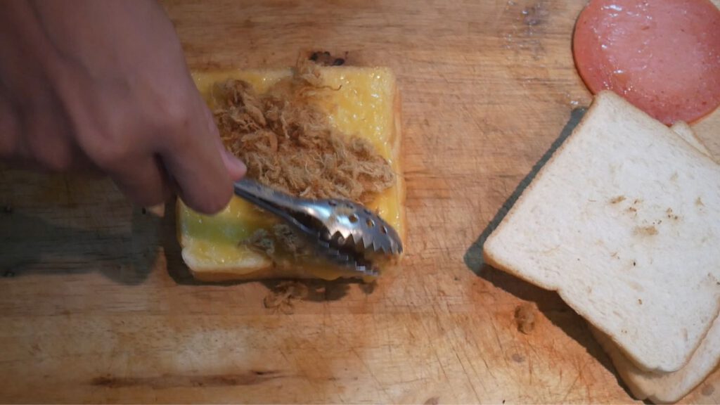 2. ชั้นที่2วางขนมปั งบนชั้นก่อนหน้านี้ทาน้ำสลัดและโรยหมูหยองตรงกลาง