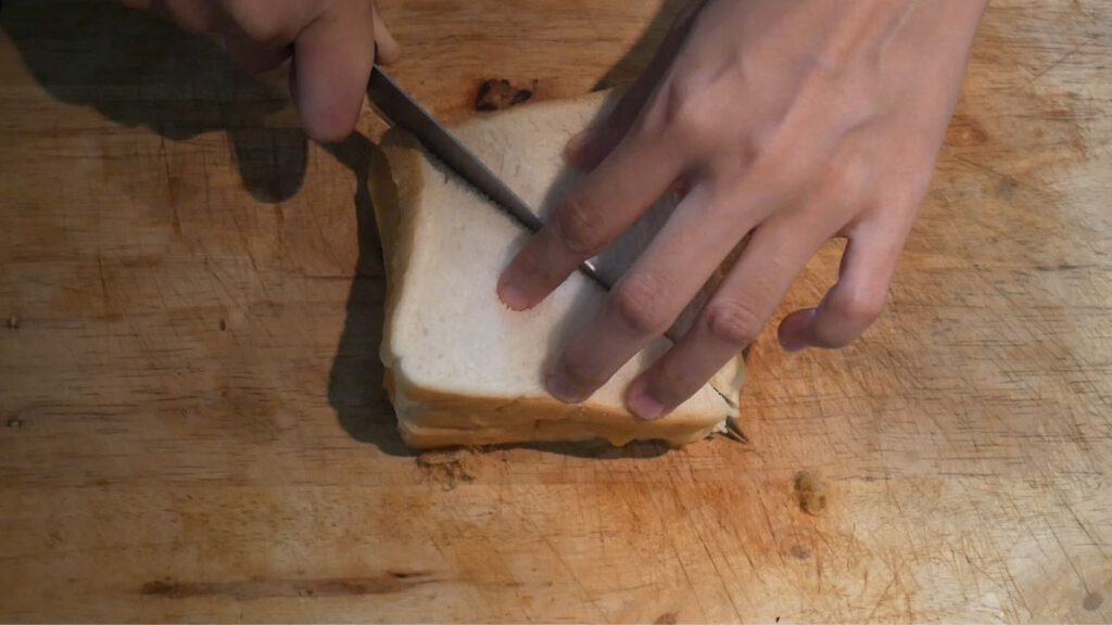 4. หั่นครึ่งตรงกลางเป็นสามเหลี่ยมเป็นอันเสร็จค่ะ