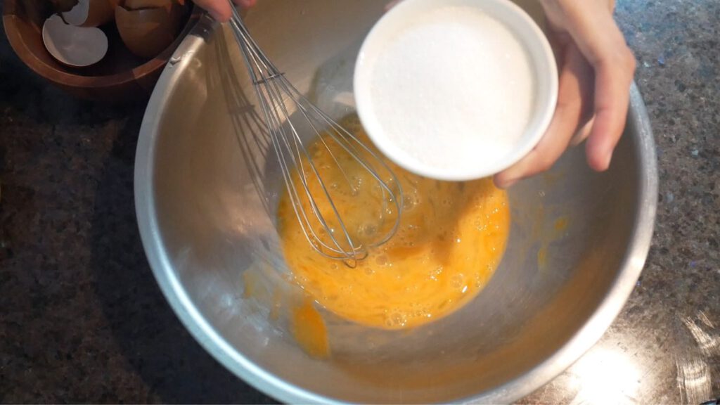 2. ระหว่างรอน้ำร้ อ นมาเตรียมทำน้ำสลัดโบราณโดยใส่ไข่ไก่ตีกับน้ำตาลทราย นมข้นหวาน น้ำตาลทรายแดง และเกลือ คนให้เข้ากัน