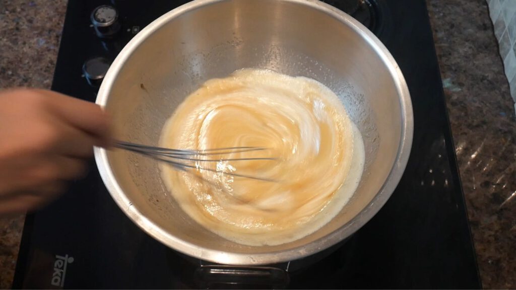 3. นำส่วนผสมที่ตีเข้ากันเอาไว้ตั้งบนหม้อที่น้ำเ ดื อด  แล้วคนไปเรื่อยๆจนกว่าไข่จะสุ กและน้ำตาลละลายจนหมด