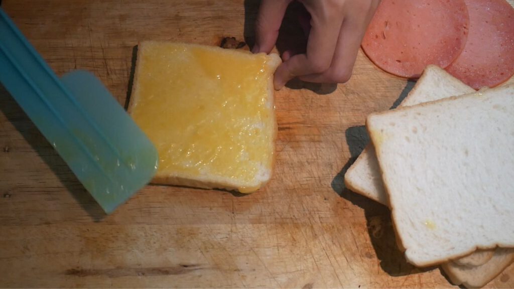 1. วางขนมปั งแล้วทาน้ำสลัดบางๆหร่อแล้วแต่ชอบแล้ววางโบโลน่า