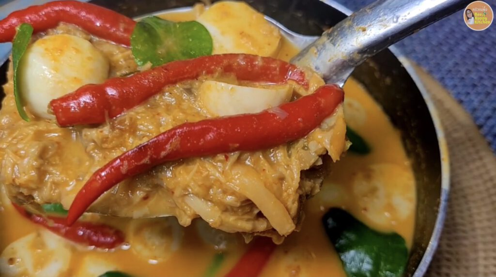 3.ใส่กะทิเล็กน้อยเ คี่ ยวกับพริกแกงจนเ ดื อ ดสีสวยน่าทาน