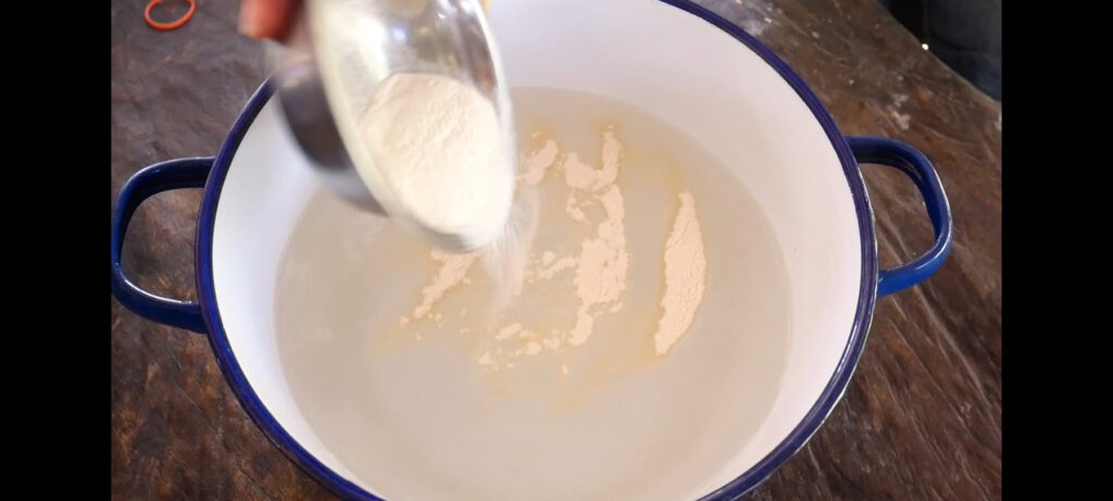 3. เมื่อวุ้นละลายดีแล้วให้ใส่น้ำตาลทราย แล้วคนให้น้ำตาลละลาย