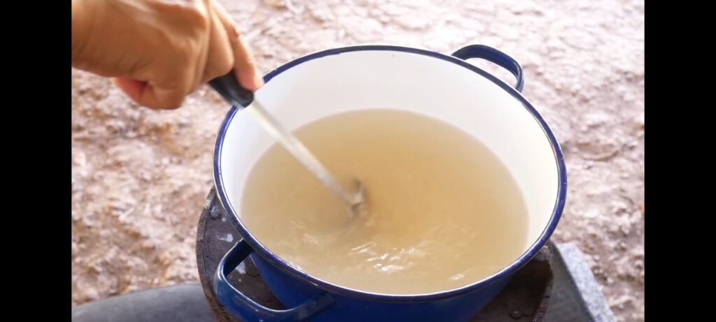 2. นำขึ้นตั้งไ ฟกลาง เ คี่ ย วไปจนกว่าน้ำจะเ ดื อ ดและวุ้นจะละลาย (คนตลอดการเ คี่ ย ว)