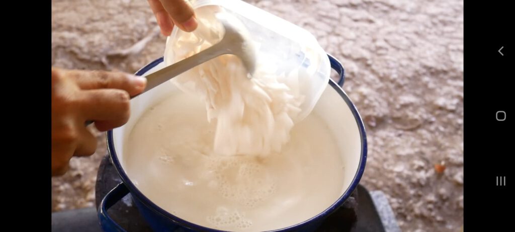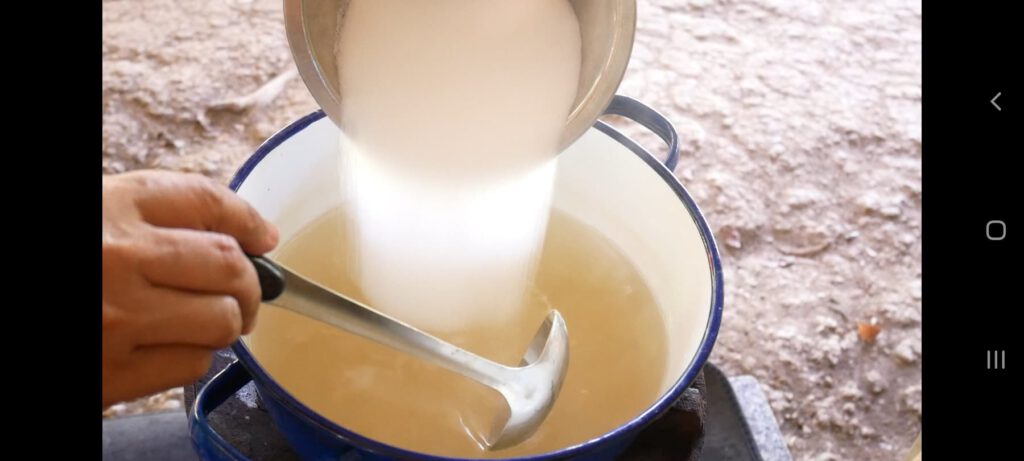 แล้วใส่เ นื้ อมะพร้าวตาม คนซักครู่แล้วปิดไ ฟ ตั้งไว้ให้อุ่น