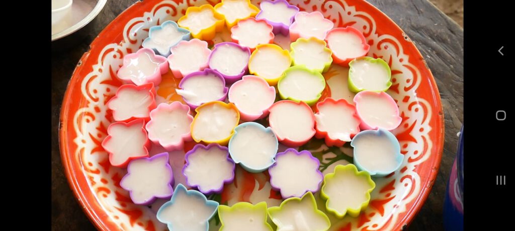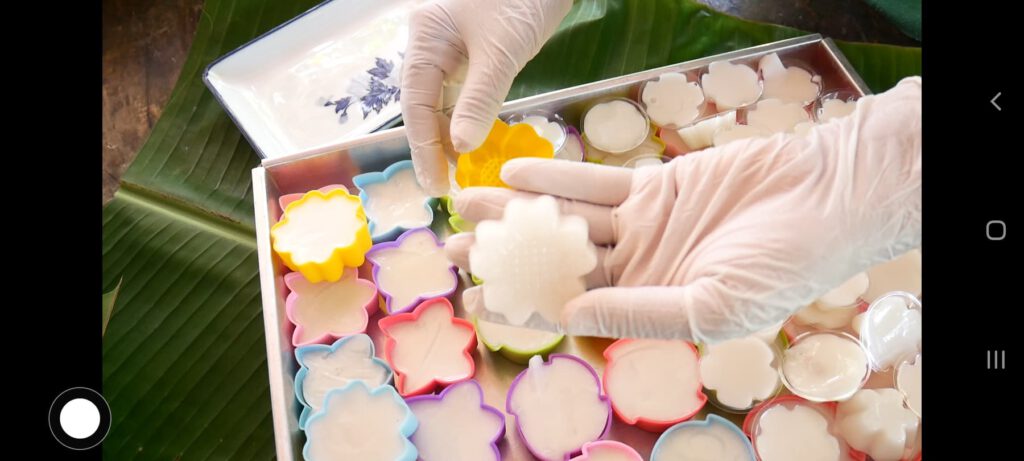 5.ตักใส่พิมพ์ แล้วตั้งทิ้งไว้ให้วุ้นเซ็ตตัวประมาณ 1-2 ชั่วโมง