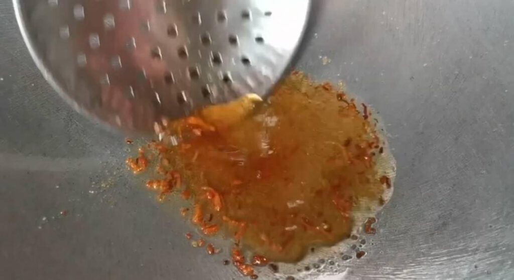 8.ใช้กระทะเดิมก็ได้เอาน้ำมันออกใส่น้ำปล าและน้ำตาลทรายลงไป