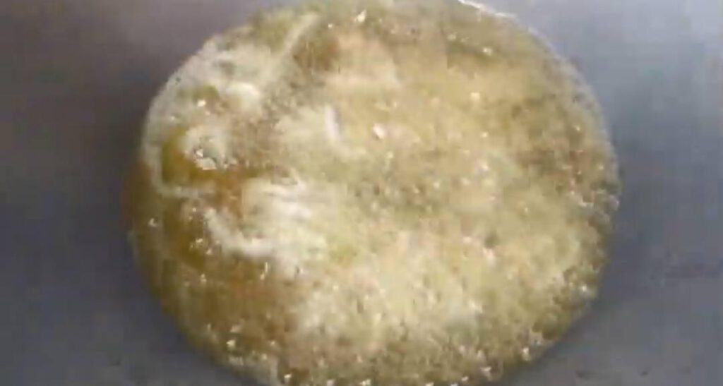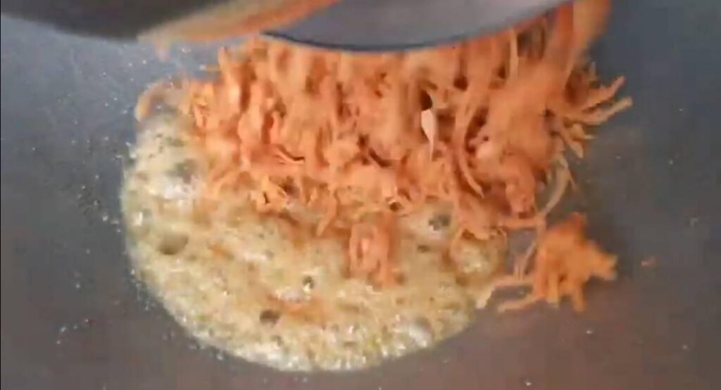 9.ใช้ไ ฟอ่อนจนน้ำตาลละลาย​ และเ ดื อ ดเป็นฟองใหญ่ๆ​นำไก่ที่ทอดไว้ลงคลุกเคล้าได้เลยค่ะ