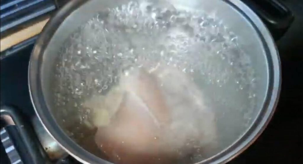 1.นำอกไก่ไปต้มจนสุ ก นำขึ้นพักให้อุ่นๆ