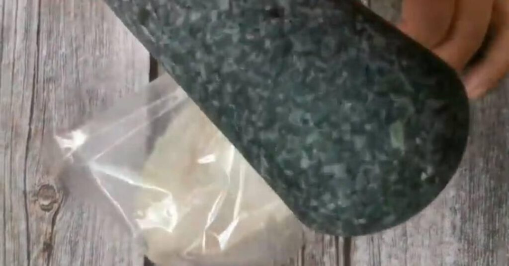 2.จากนั้นนำใส่ถุงพลาสติกทุ บๆสักหน่อยจะช่วยให้ฉี กเป็นเส้นได้ง่าย