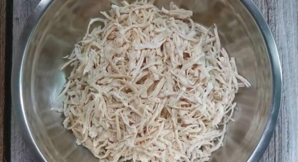 3.มาถึงขั้นตอนที่ย ากที่สุด​ นั่นก็ก็การฉี กไก่เป็นเส้นบางๆนี่ล่ะ