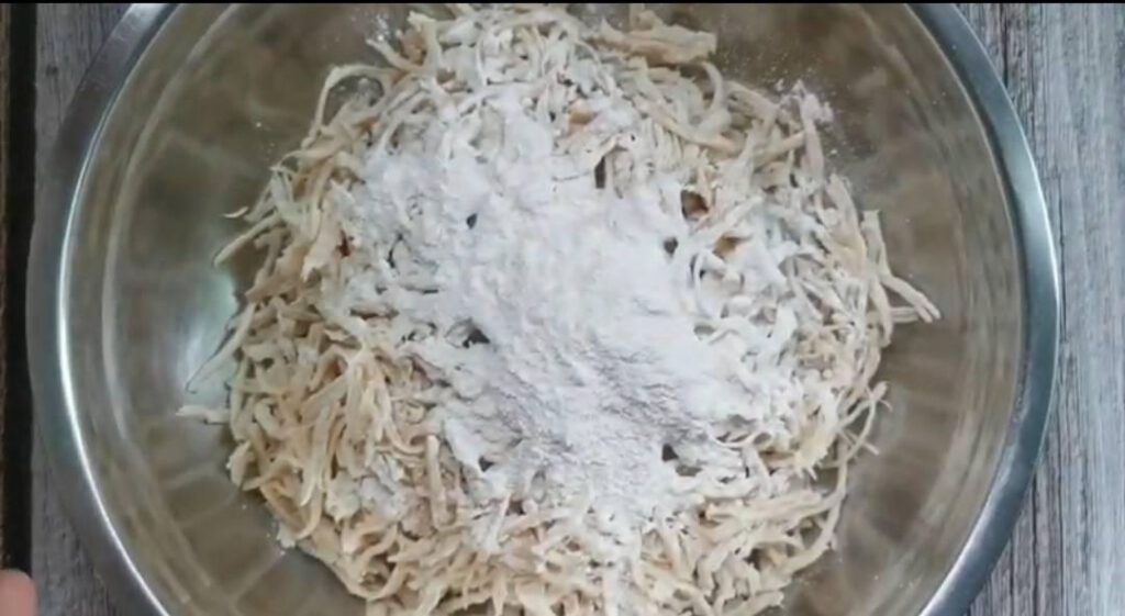 4.เสร็จแล้วใส่แป้งทอดกรอบลงไปเคล้าให้พอเคลือบบางๆ