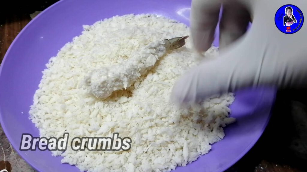 8.นำมาคลุกกับเกล็ดขนมปั งอีกรอบ ทำแบบนี้จนครบเลยนะคะ
