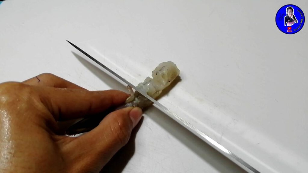 3.นำกุ้งมาผ่ าแนวขวาง ใต้ท้องกุ้ง อย่ าผ่ าให้ขาดนะคะ เพื่อที่จะให้ตัวกุ้งตรง ไม่งอ
