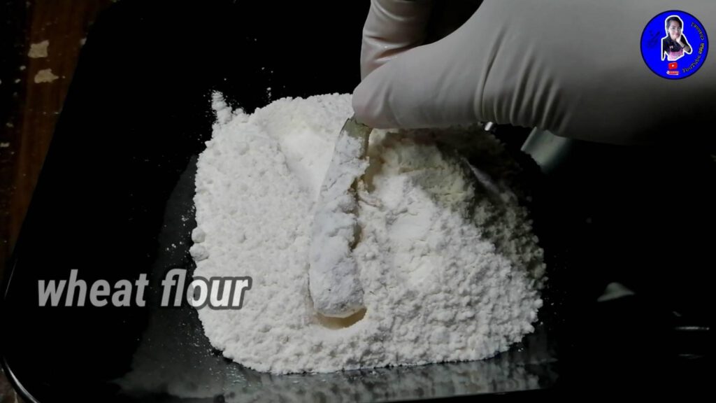 6.นำกุ้งมาคลุกด้วยแป้งสาลีก่อน ให้ทั่วตัว