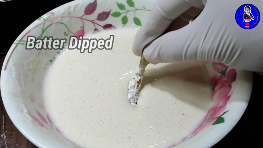 7.หลังจากนั้นก็นำไปชุบแป้งที่ผสมไว้