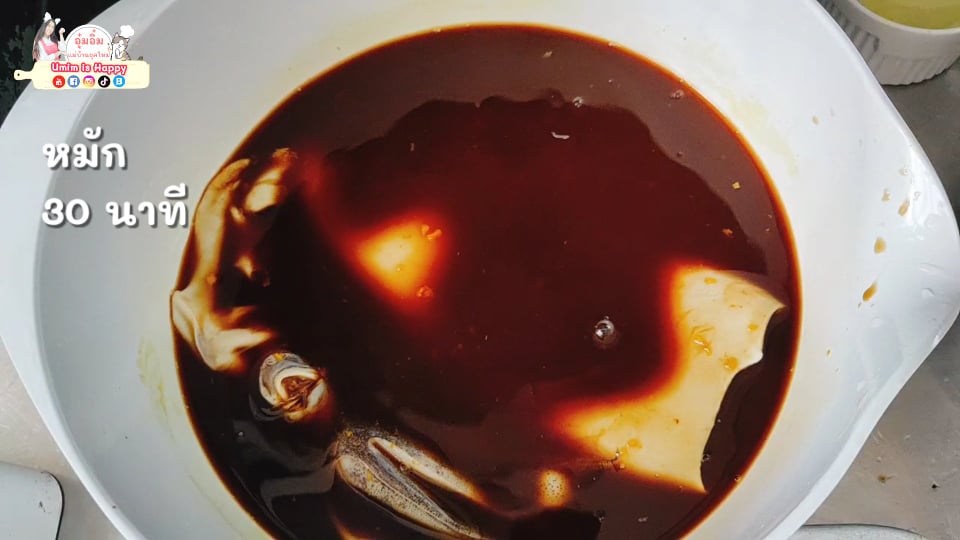 4.เอาปล าหมึกไปแช่ หมักทิ้งไว้ 30 นาทีค่ะ