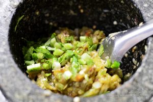 2.หลังจากย่ างเสร็จ นำมาโขลกและโรยเกลือลงไป ชิมรสตามใจชอบ