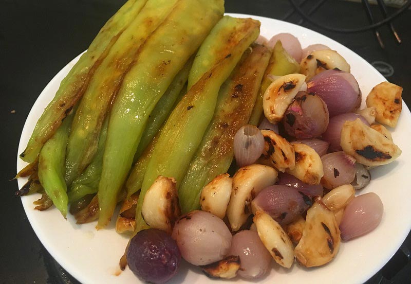 1.นำพริกหนุ่ม หอมแดง กระเทียมไปย่ างให้หอมและแกะเปลือกออก