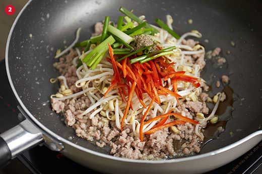และถั่วงอกตามลงไปผัดและ คลุกเคล้าให้ทั่วพอทุกอย่ างสุ กได้ที่แล้ว ปิดไ ฟลง และใส่ต้นหอมไปผัดอีก