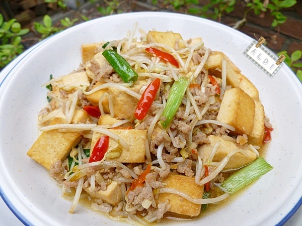 ให้ส่งกลิ่นหอม ตามด้วยใส่เต้าหู้และหมูสั บลงไปผัดให้สุ ก สีของเต้าหู้สีเหลืองสวยงาม