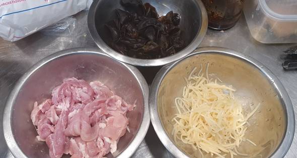 2.ตามด้วยขิ งแก่ ผัดจนทุกอย่ างสุ กดีแล้วตามด้วยเห็ดหูหนู หอมหัวใหญ่ ลงไปผัดให้ส่วนผสมทุกอย่ างเข้ากัน