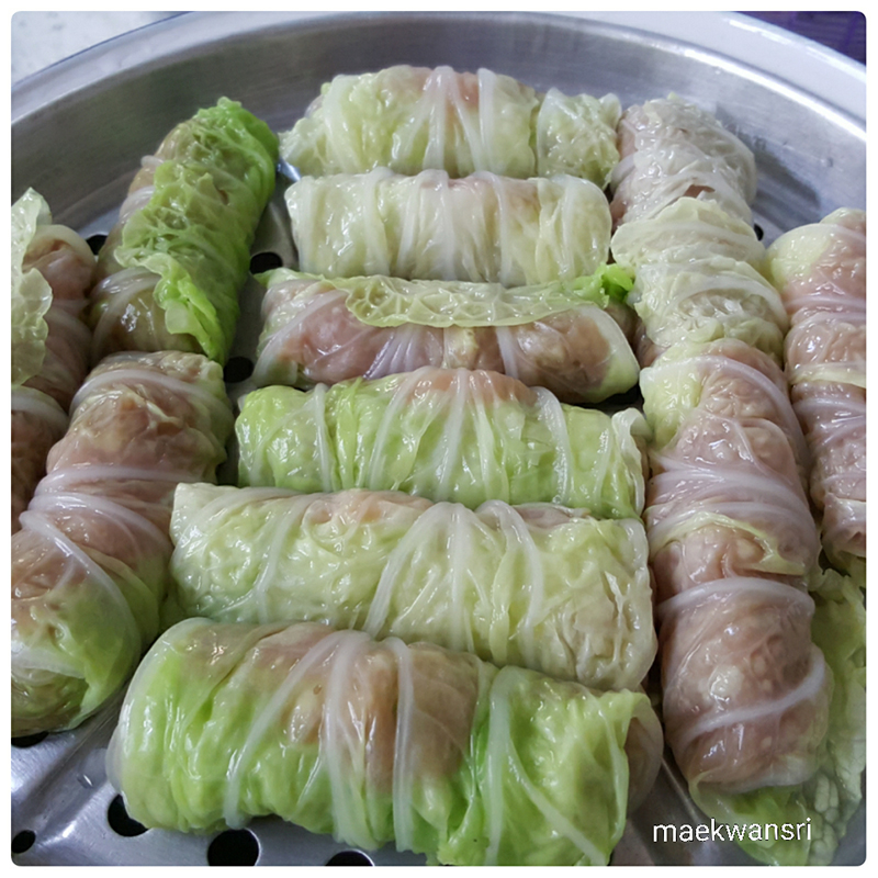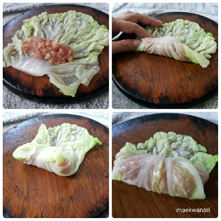3.ขั้นตอนการห่อ ให้นำผักกาดขาวว่างแผ่ออกแล้วนำหมูบ ดที่แช่ไว้ในตู้เย็นออกมา จัดวางหมูบ ดลงบนผักกาดขาว