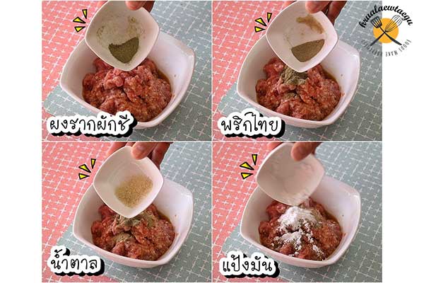1.เริ่มจากหมักหมู ด้วยการใส่ซีอิ๊วขาวตราเมกาเชฟ น้ำตาล พริกไทย ผงร ากผักชี แป้งมัน จากนั้นผสม