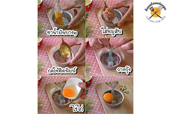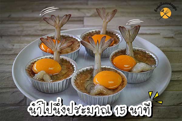 4.ใส่กุ้งลงไปตรงกลาง ให้หางโผล่เลยถ้วยขึ้นมา ในลักษณะหางชี้ฟ้า