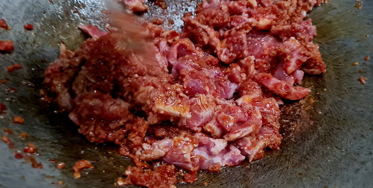 3.หลังจากนั้นนำเ นื้ อหมู ใส่ลงไปผัดกับเครื่องแกงคลุกเคล้าให้จนเครื่องแกงเข้ากับเ นื้ อไก่ระหว่างนั้น