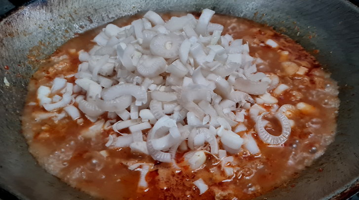 5.เมื่อน้ำแกงเ ดื อ ดแล้วก็ใส่หยวกกล้วยที่หั่นฝอยแล้วลงไปในหม้อ คนให้เข้ากับน้้าแกง จนกว่าหยวกกล้วยจะสุ ก