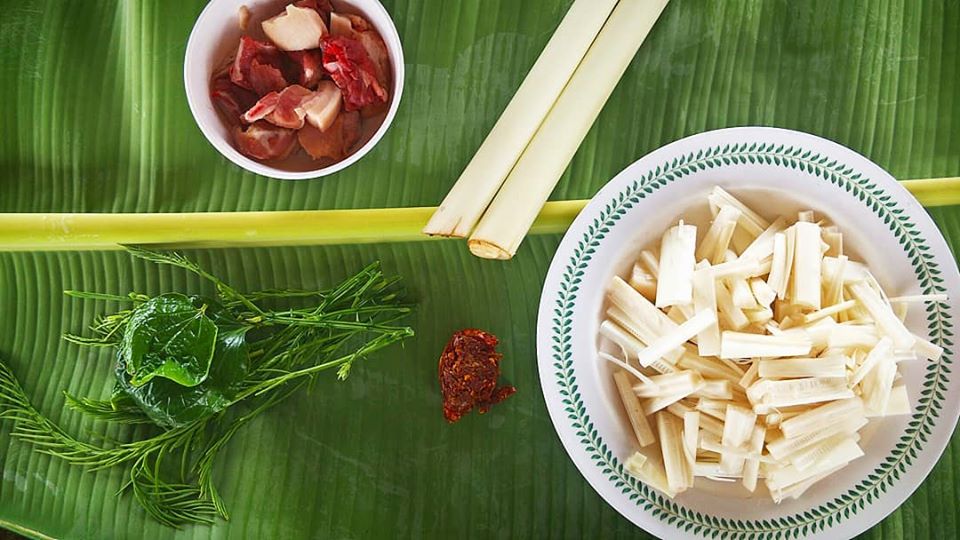 ตะไคร้ ข่ า กระช าย เม็ดผักชี ร ากผักชี ผิวมะกรูด ใบมะกรูด กะปิและ เกลือไปโขลกรวมกัน