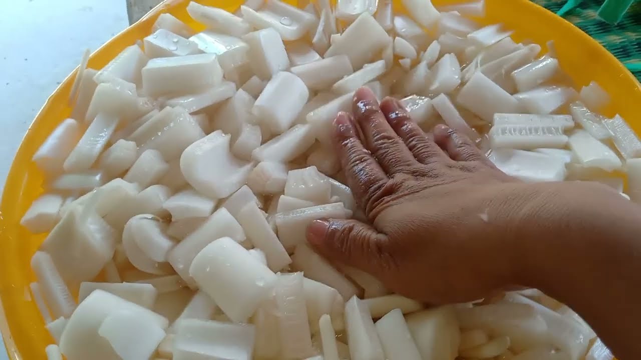 1.นำหยวกกล้วยมาซอยให้ละเอียดแล้วแช่ในน้ำเกลือ เพื่อไม่ให้หยวกมีสีคล้ำจนไม่น่าทานแช่ทิ้งไว้สักพัก
