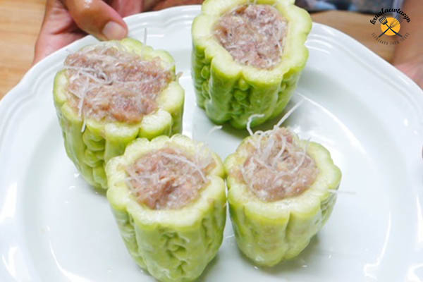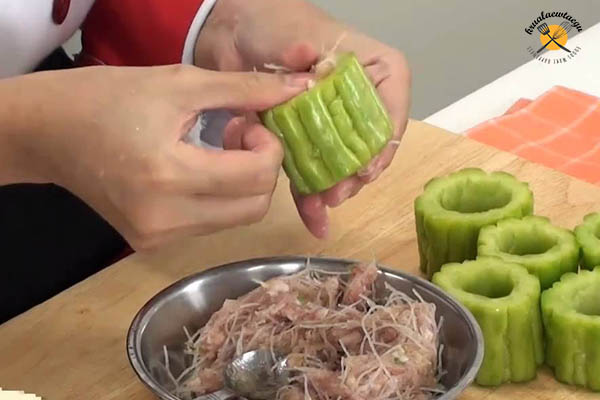 4.นำหมูสั บที่เตรียมไว้ มายัดใส่มะระที่หั่นเป็นท่อน ๆ ไว้ โดยพย าย ามยัดให้เต็ม เพื่อกันไ ส้ไหลตอนต้ม