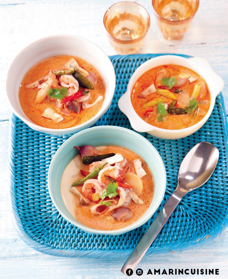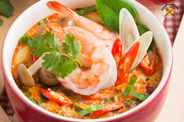 ตะไคร้ หอมเล็ก นมสด พอน้ำซุปเ ดื อ ดใส่กุ้ง และใบมะกรูดฉี ก พอกุ้งสุ กดี ปิดไ ฟ ปรุงรสโดยผสมน้ำพริกเ ผ า