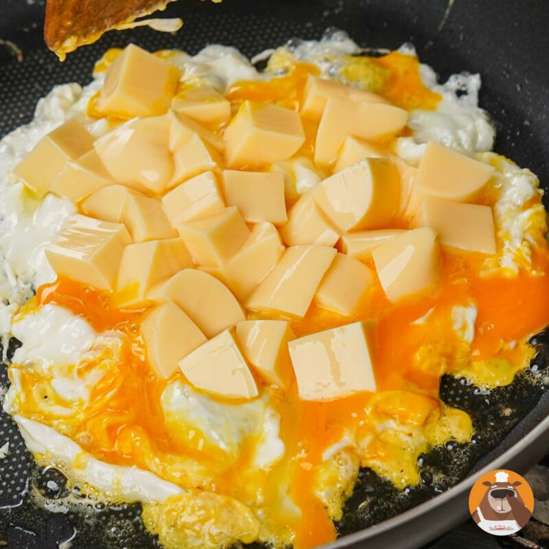 2.พอเกือบสุ กใส่เต้าหู้ไข่ที่หั่ นแล้ว เทลงบนไข่ไปเลย จากนั้นเหยาะน้ำปล าลงไปนิดนึงให้มีกลิ่นหอม