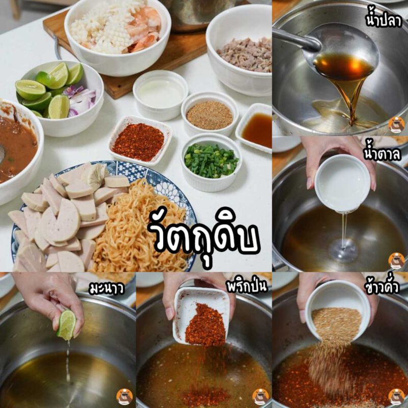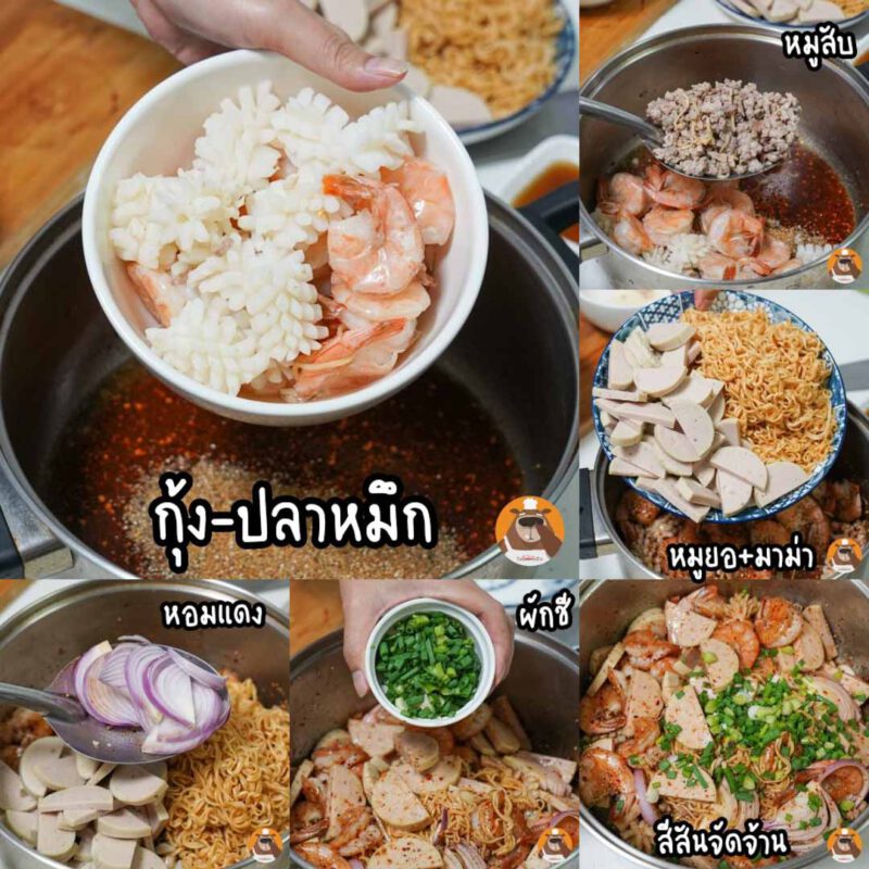 1.ล ว กมาม่ า, กุ้ง, ปล าหมึก, หมูสั บและหมูยอ เสร็จแล้วนำขึ้นมาพักไว้