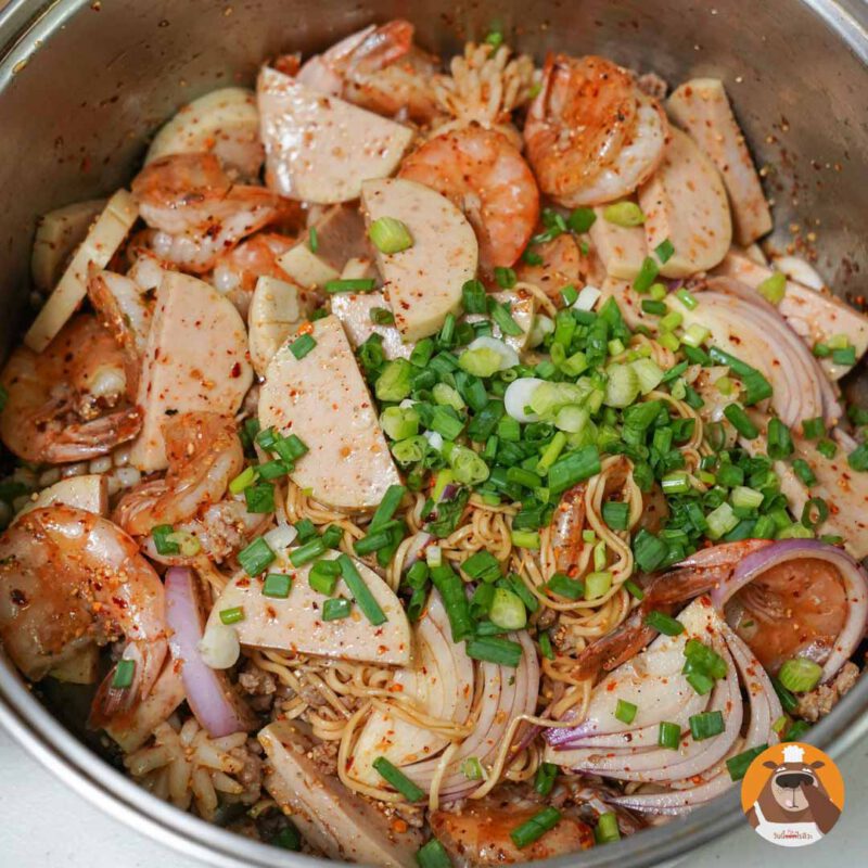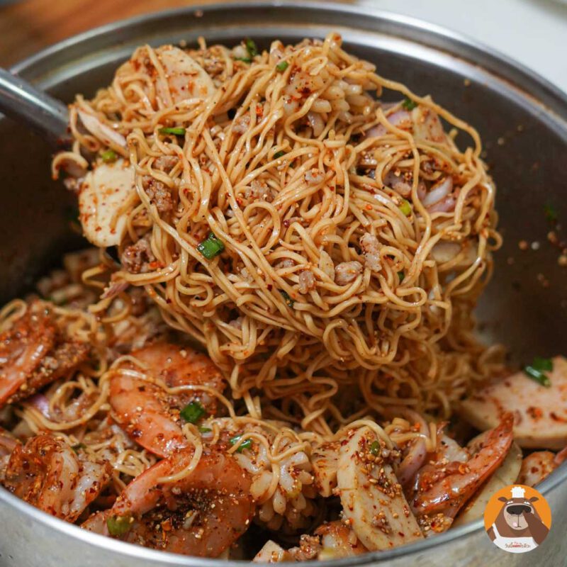 3.ใส่เ นื้ อสั ต ว์ที่ล ว กแล้วลงไป ตามด้วยมาม่ าและหอมแดง คลุกเคล้าให้เข้ากันอีกครั้ง