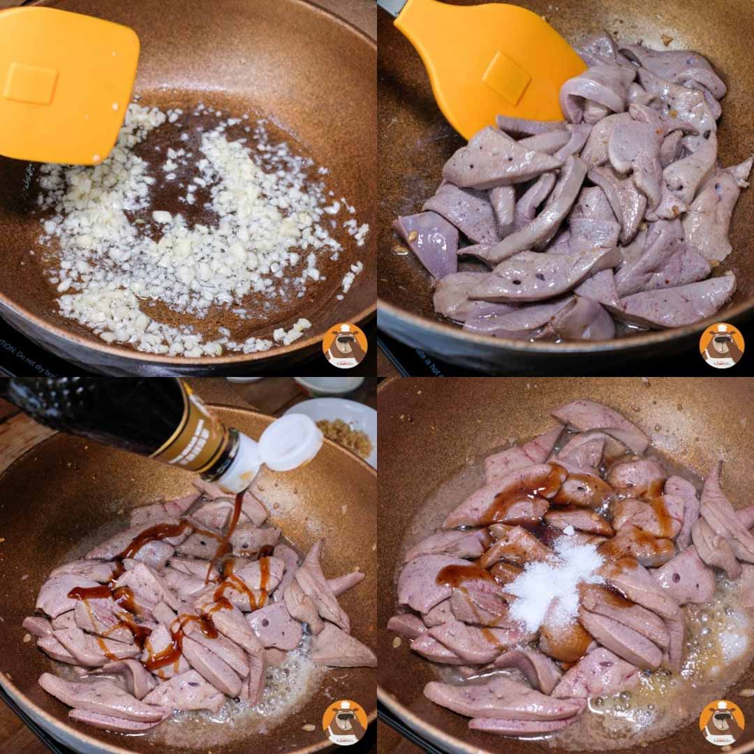 5.ใส่น้ำมันหอย, ซอสปรุงรส, น้ำตาล, และผงรสดี ชิมรสช าติ เมื่อได้รสช าติตามต้องการแล้วใส่ต้นกระเทียมที่หั่นไว้