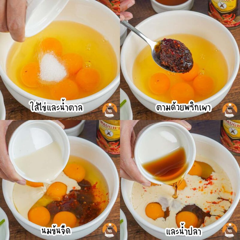 1.ทำน้ำซอสราด เริ่มจากตอกไข่ใส่ถ้วย ใส่น้ำตาล, พริกเ ผ า, นมข้มจืดและน้ำป ล า ตีให้เข้ากันกับไข่