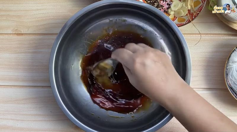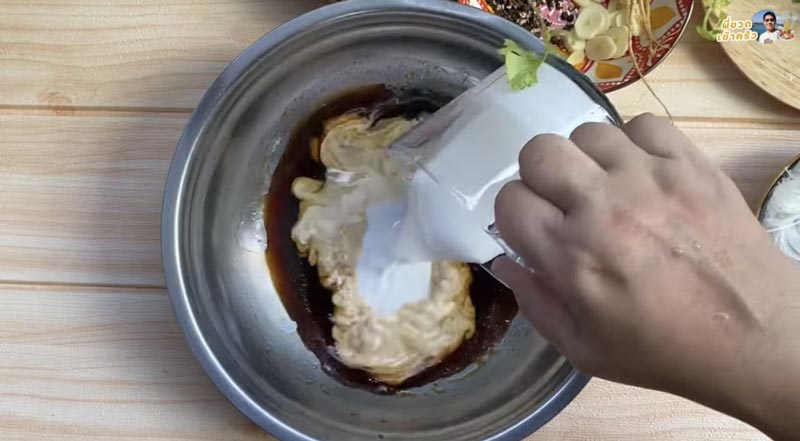 1. ทำน้ำซอส โดยผสมซอสหอยนางรม ซอสปรุงรส ซีอิ๊วขาว น้ำตาลทราย ซีอิ๊วดำ น้ำมันง า