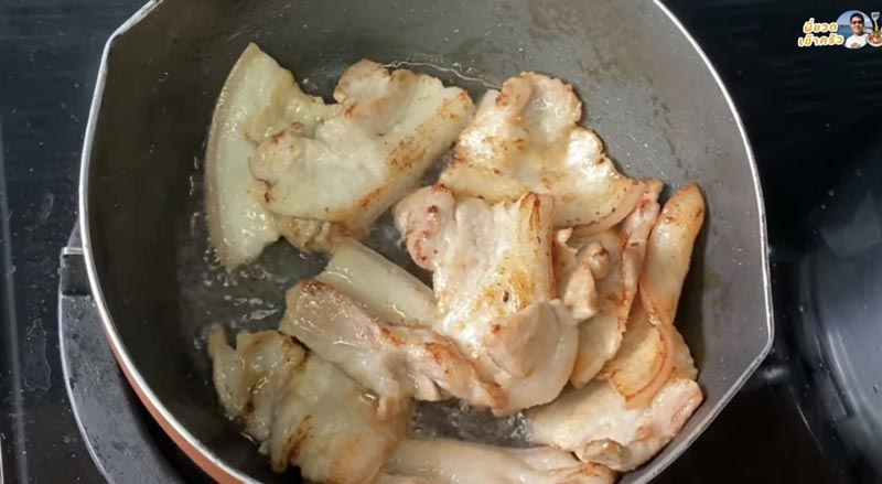 4. ตั้งกระทะใส่สามชั้นลงไปผัดจนเหลืองกรอบ หรือสุ กตามชอบ