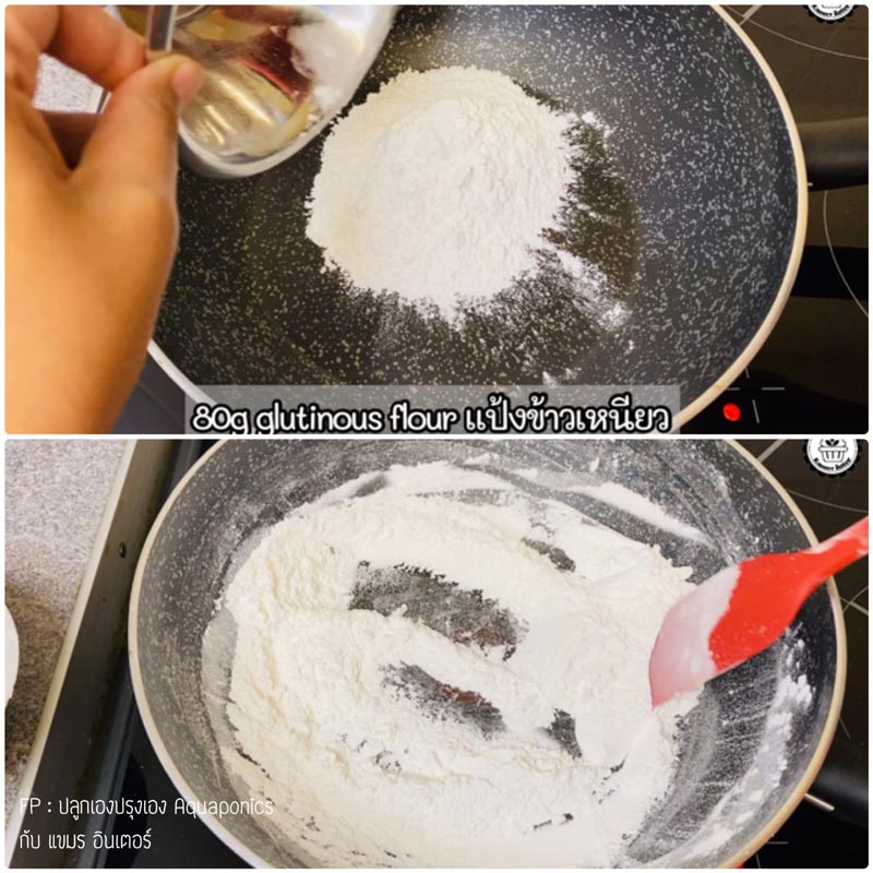 ☆ ทำการผัดแป้งนวลรอไว้เพื่อใช้ในตอนที่ขึ้นรูป แป้งจะได้ไม่ติดมือ โดยนำแป้งข้าวเหนียวผัดในกระทะ