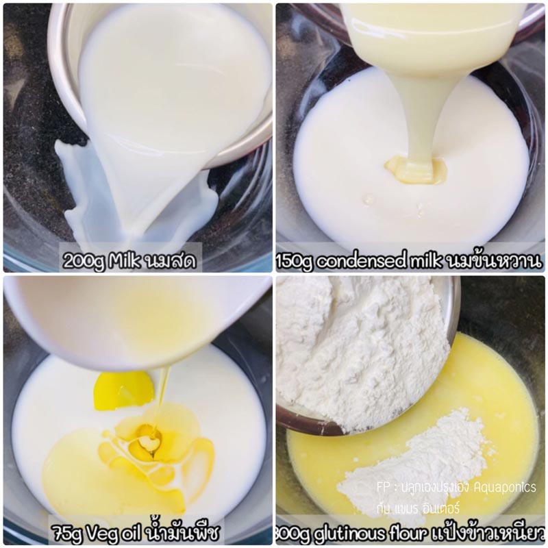 ☆ มาเตรียมในส่วนของแป้งโมจิ โดยเทนมสด นมข้นหวาน น้ำมันพืช และแป้ง ลงในชามผสม คนทุกอย่ าง