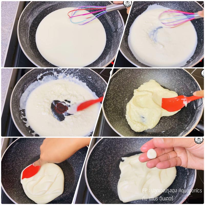 ผัดจนกระทั่งแป้งใสขึ้น ไม่ติดกระทะ และลองจับขึ้นมาปั้นดู ถ้าไม่ติดนิ้วแสดงว่าใช้ได้แล้ว