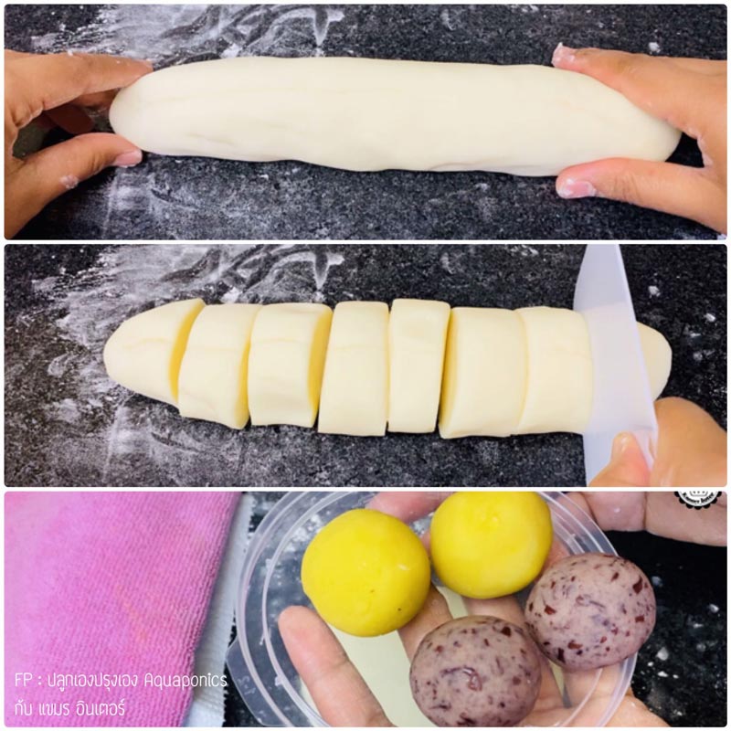 ☆ นำแป้งที่ผัดได้มานวดเบา ๆ ก่อนทำการตัดแบ่งให้ได้ขนาดเท่า ๆ กัน ไ ส้ที่จะห่อวันนี้มีไ ส้ถั่วแดงกวนกับไ ส้ถั่วเขียว